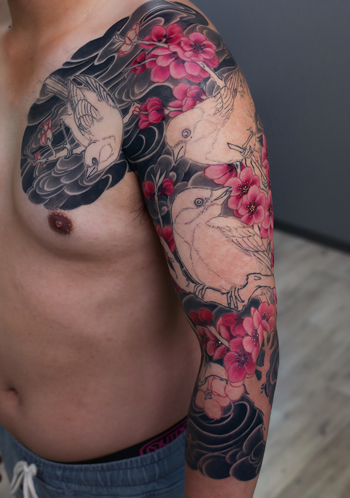 2023.09.02 あんずの花 シジュウカラ 腕七分袖 製作中 あんずの花中心の施術でした。だいぶ形づいてきましたね。 お疲れ様でした。 制作事例 関連する記事 菊水 腕十分袖 和彫り 2026.01.07 八岐大蛇 ヤマタノオロチ 腕十分袖 和彫り 2025.12.23 一匹龍 腕十分袖 和彫り 2025.12.23