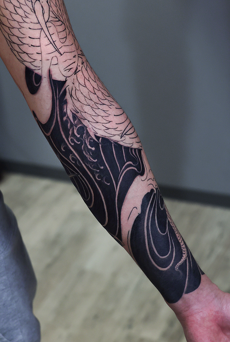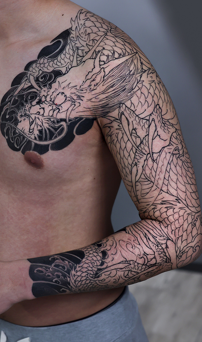2025.12.23 一匹龍 腕十分袖 和彫り 内側の額中心の施術でした。額はしっかりと濃く入ることで、のちの主体を引き立たせます。 これから益々迫力がでてくる龍かと思います! 遠方からありがとうございます。ひきつづき頑張っていきましょう。お疲れ様でした。 制作事例 関連する記事 菊水 腕十分袖 和彫り 2026.01.07 八岐大蛇 ヤマタノオロチ 腕十分袖 和彫り 2025.12.23 夜叉 生首 脚一本 和彫り 2025.12.23