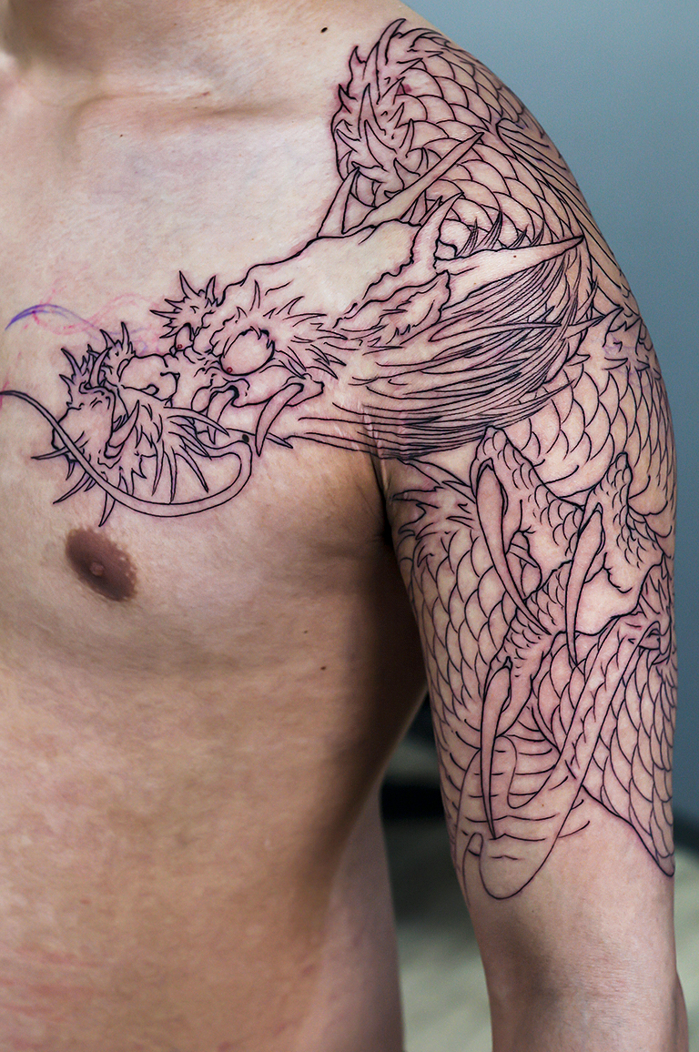 2025.10.13 一匹龍 腕十分袖 和彫り 開始しました。 腕の大きさに合わせたベストなバランスです。額彫りで十分袖、しっかりと仕上げていきたいと思います。 初回お疲れ様でした。ゆっくりと休んでくださいね。 遠方からありがとうございました。ひきつづき頑張っていきましょう! 制作事例 関連する記事 菊水 腕十分袖 和彫り 2026.01.07 八岐大蛇 ヤマタノオロチ 腕十分袖 和彫り 2025.12.23 一匹龍 腕十分袖 和彫り 2025.12.23