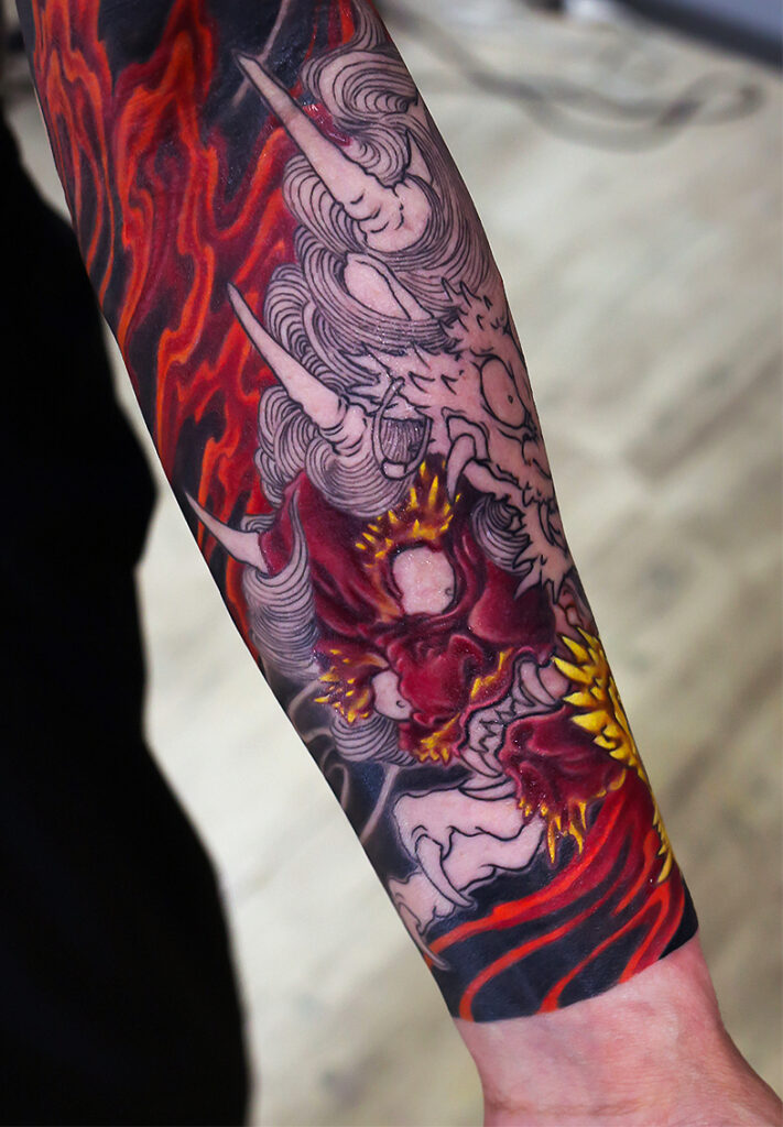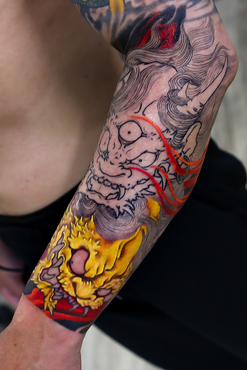 2024.06.17 三面鬼図 腕 製作中 黄鬼のカラーメインの施術でした。 徐々にカラーが入り形づいてきました。目や口などディテール部分が入るとまた一段と雰囲気も格好良く変わってくると思います。 お疲れ様でした。引き続き頑張っていきましょう! 制作事例 関連する記事 菊水 腕十分袖 和彫り 2026.01.07 八岐大蛇 ヤマタノオロチ 腕十分袖 和彫り 2025.12.23 一匹龍 腕十分袖 和彫り 2025.12.23