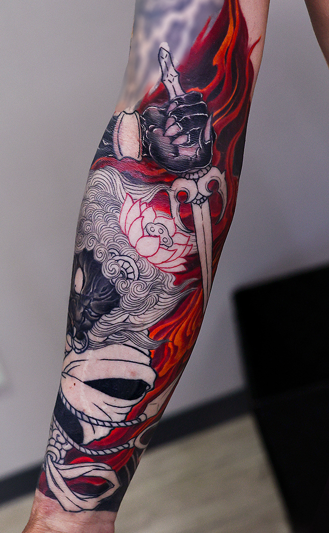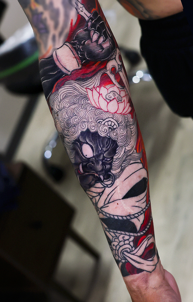 2025.08.03 不動明王 腕 和彫り 良い表情です。着物や目などにカラーが入ってくると、より格好良くなっていくと思います。 少しあせもができてしまっていますが、インク残りは大丈夫でしょう。 お疲れ様でした。引き続き頑張っていきましょう 制作事例 関連する記事 菊水 腕十分袖 和彫り 2026.01.07 八岐大蛇 ヤマタノオロチ 腕十分袖 和彫り 2025.12.23 一匹龍 腕十分袖 和彫り 2025.12.23