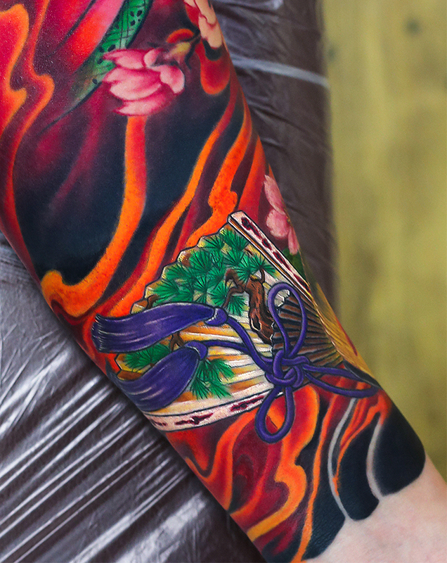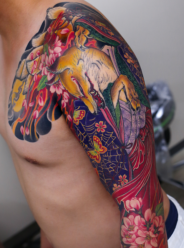 2023.06.17 九尾狐 十分袖延長 扇子に松の木を入れました。 細かい施術でしたが、とてもよい風合いに仕上がったと思います。 九尾狐とも相性が良いです! お疲れ様でした。 またお待ちしております。 ありがとうございました 制作事例 関連する記事 菊水 腕十分袖 和彫り 2026.01.07 八岐大蛇 ヤマタノオロチ 腕十分袖 和彫り 2025.12.23 一匹龍 腕十分袖 和彫り 2025.12.23