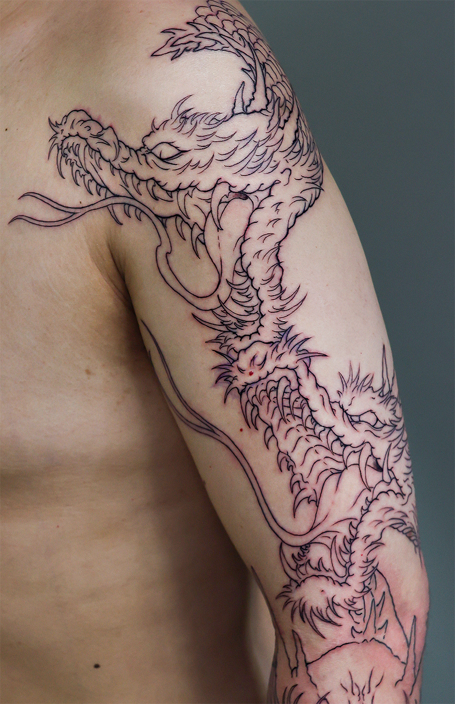 2025.08.31 八岐大蛇 ヤマタノオロチ 腕十分袖 和彫り 開始です!片腕に4つの頭、両腕に入る予定です。 八岐大蛇は八つの頭を持つ以外にも独特な雰囲気を持っていますので、それを大いに表現していけたらと思います。 初回お疲れ様でした。ゆっくりと休んでくださいね。 制作事例 関連する記事 菊水 腕十分袖 和彫り 2026.01.07 八岐大蛇 ヤマタノオロチ 腕十分袖 和彫り 2025.12.23 一匹龍 腕十分袖 和彫り 2025.12.23