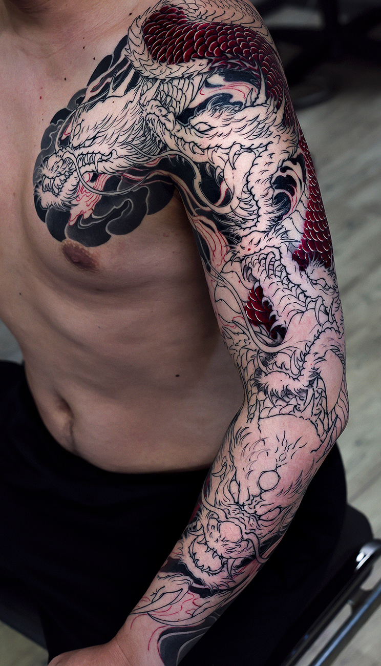 2026.03.30 八岐大蛇 腕十分袖 刺青 和彫り オロチの顔、一つ一つに表情と躍動感をだせていけたらと思います。 お疲れ様でした。 制作事例 関連する記事 雷神 達磨 腕十分袖 刺青 和彫り 2026.03.30 花鳥風月 椿 腕八分袖 刺青 和彫り 2026.03.30 一匹龍 腕十分袖 刺青 和彫り 2026.03.30