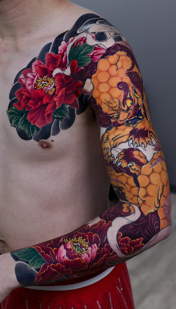 唐獅子牡丹 腕十分袖 和彫り