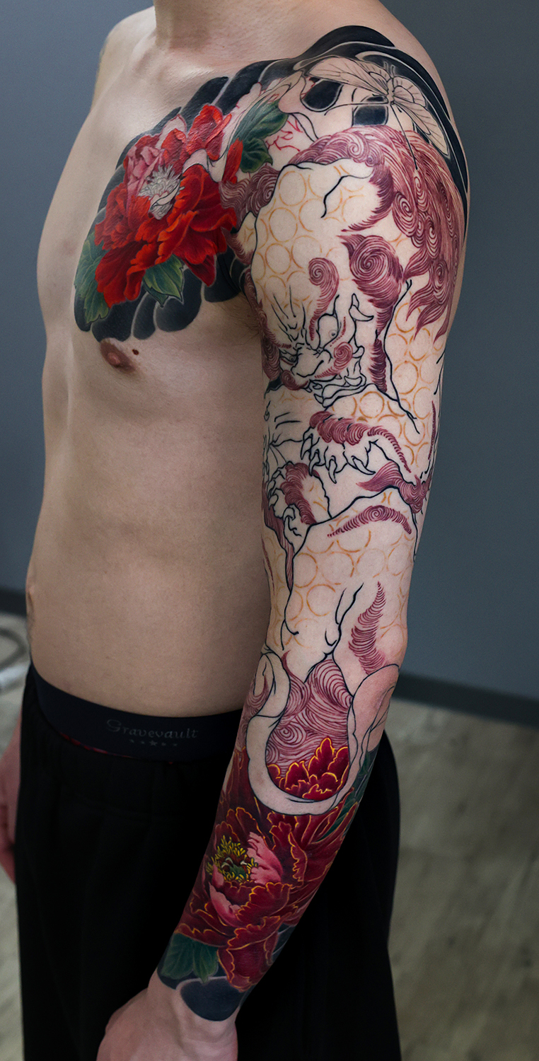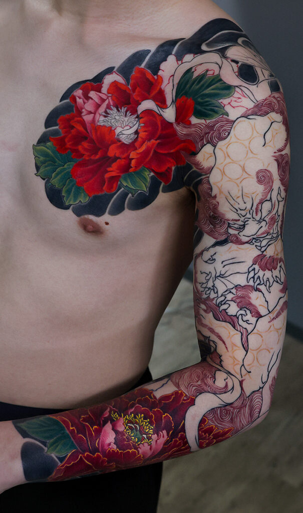 2025.03.14 唐獅子牡丹 腕十分袖 胸の牡丹に入りました。 綺麗です!カラーの進みが楽しみです。 前回のケア、バッチリでした。 ひきつづき頑張っていきましょう!お疲れ様でした。 制作事例 関連する記事 菊水 腕十分袖 和彫り 2026.01.07 八岐大蛇 ヤマタノオロチ 腕十分袖 和彫り 2025.12.23 一匹龍 腕十分袖 和彫り 2025.12.23