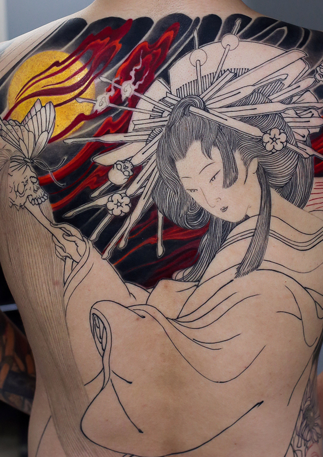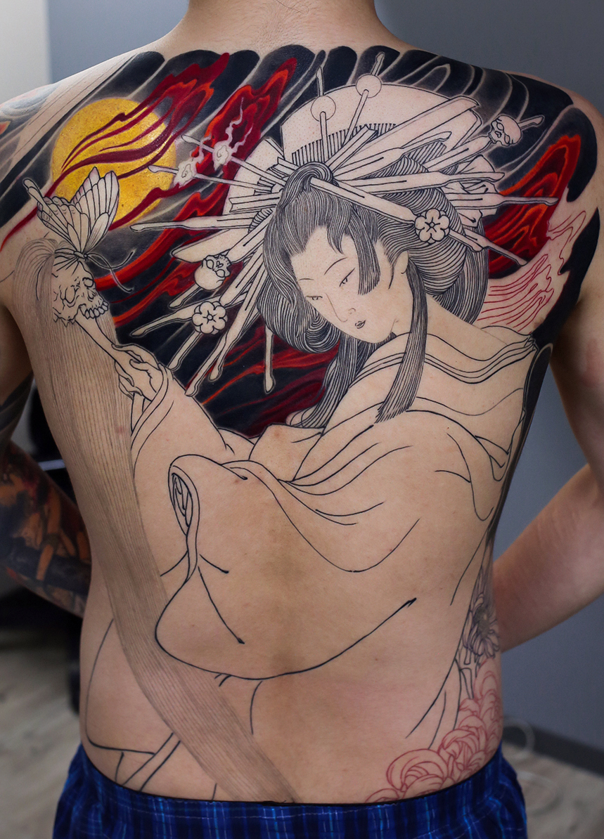 2024.07.24 地獄太夫 背中一面 製作中 月にカラーが入りました。黄色単色のべた塗りではなく明るさの微妙に異なる黄色を3色使っています。 刺青のカラーは、写真では分かりづらくても実際の身体では表現できていたりすることが多いので、多色を使うようにしています。 手前の炎を暗めにすることによって月明りを強調させています。まだ赤みが少し残っていますがカラーが馴染んでくると、より雰囲気がでてくると思います。 格好良いですね! ひきつづき頑張っていきましょう。お疲れ様でした。 制作事例 関連する記事 菊水 腕十分袖 和彫り 2026.01.07 八岐大蛇 ヤマタノオロチ 腕十分袖 和彫り 2025.12.23 一匹龍 腕十分袖 和彫り 2025.12.23