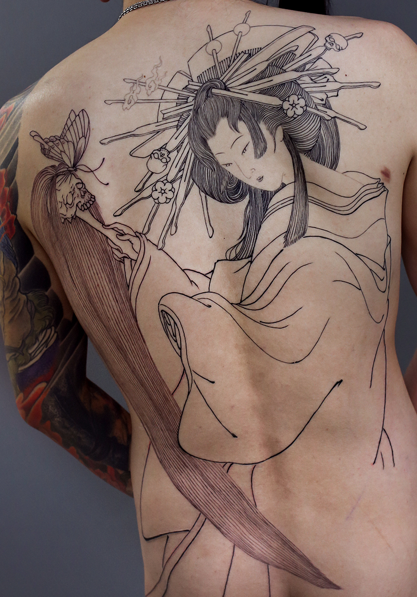 2024.03.13 地獄太夫 背中一面 製作中 引き続き筋彫りです。 骸骨で作られた長い払子を持ち、そこに蝶がとまっている様子です。 バランスとても良いです。のちに着物に地獄絵図を描いていきます。 お疲れ様でした。ひきつづき頑張りましょう。 制作事例 関連する記事 菊水 腕十分袖 和彫り 2026.01.07 八岐大蛇 ヤマタノオロチ 腕十分袖 和彫り 2025.12.23 一匹龍 腕十分袖 和彫り 2025.12.23