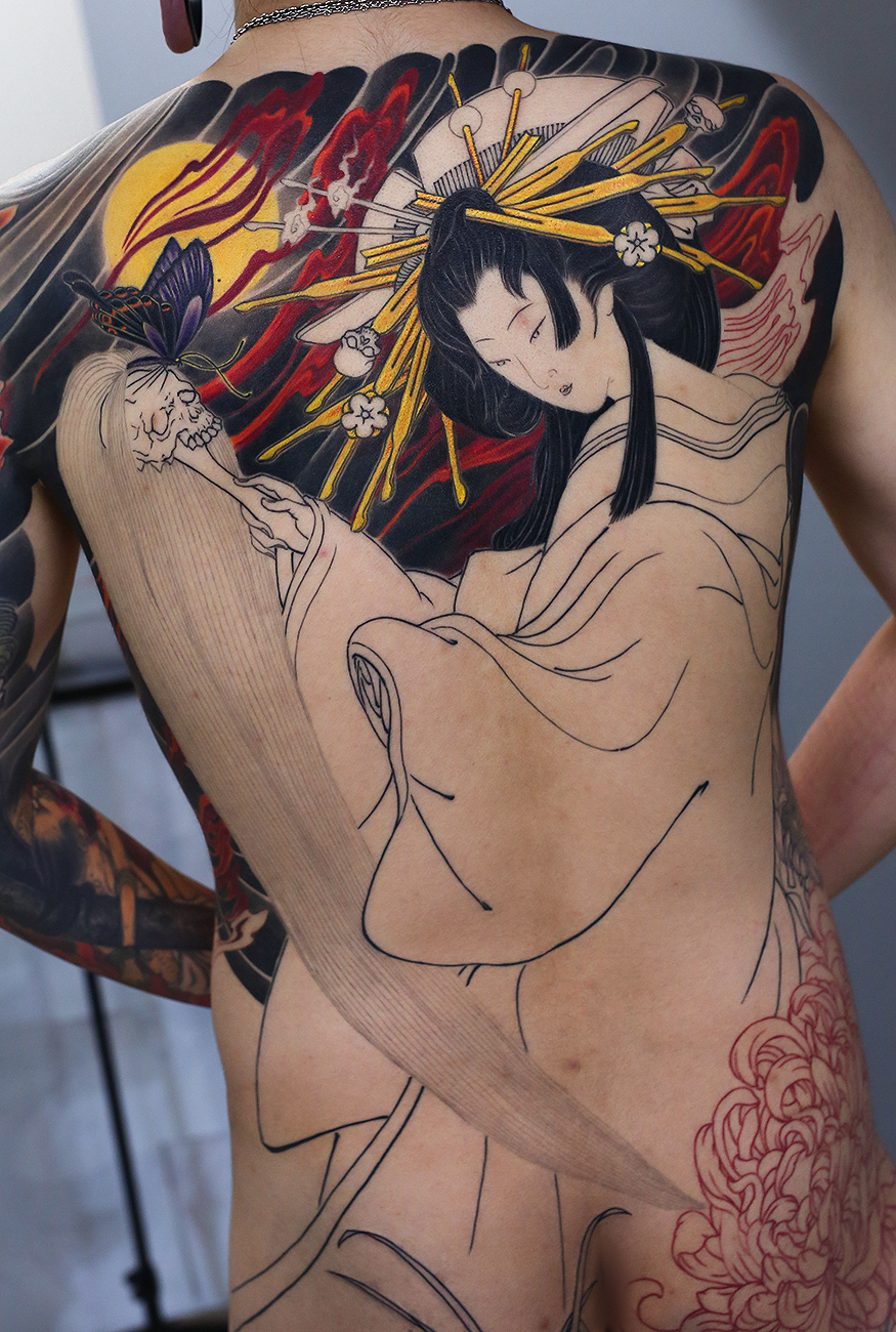 2024.12.15 地獄太夫 背中一面 太もものサブモチーフメインの施術でした。 野ざらし、草むらのなかの骸骨になります。 カラーが入ってくると、また一段と良い感じになってくると思います。 お疲れ様でした。 制作事例 関連する記事 菊水 腕十分袖 和彫り 2026.01.07 八岐大蛇 ヤマタノオロチ 腕十分袖 和彫り 2025.12.23 一匹龍 腕十分袖 和彫り 2025.12.23