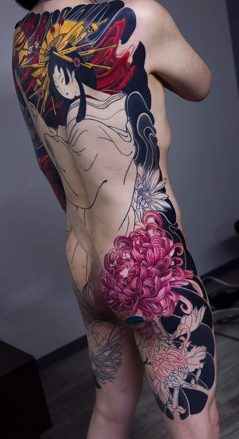 2025.08.03 地獄太夫 菊 背中一面 和彫り 脇の見切り 額がつながりました。 額は和彫り独特のもので主体を引き立たせる重要な要素です。引き締まって格好良いです! ひきつづき頑張っていきましょう!お疲れ様でした。 制作事例 関連する記事 菊水 腕十分袖 和彫り 2026.01.07 八岐大蛇 ヤマタノオロチ 腕十分袖 和彫り 2025.12.23 一匹龍 腕十分袖 和彫り 2025.12.23