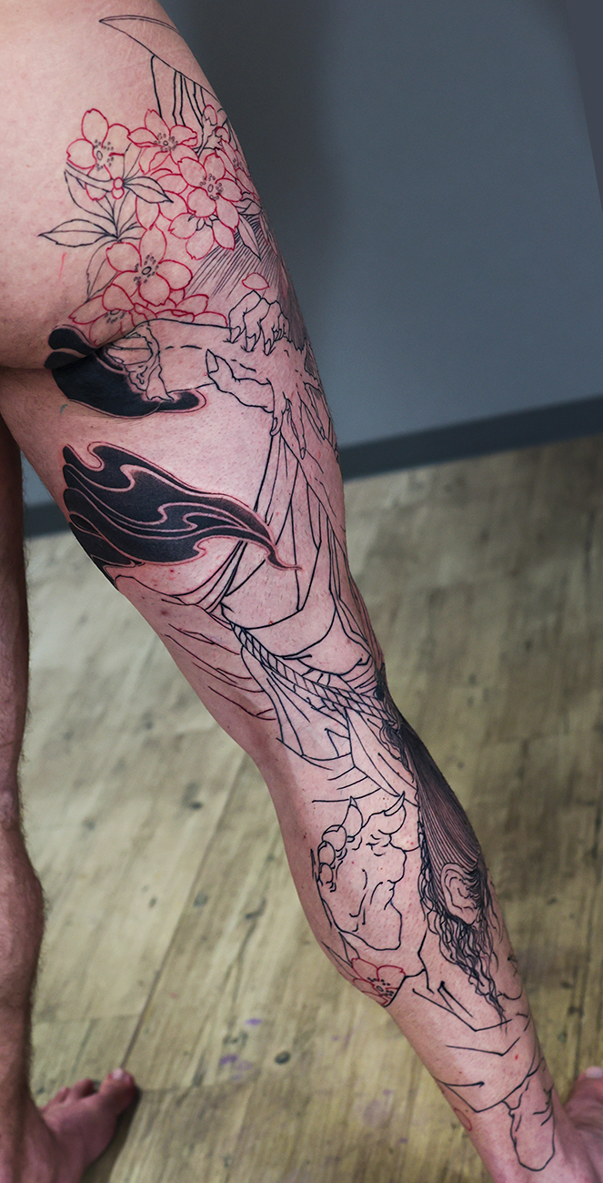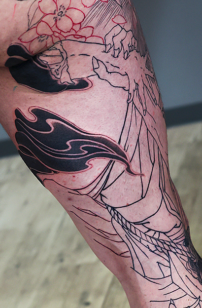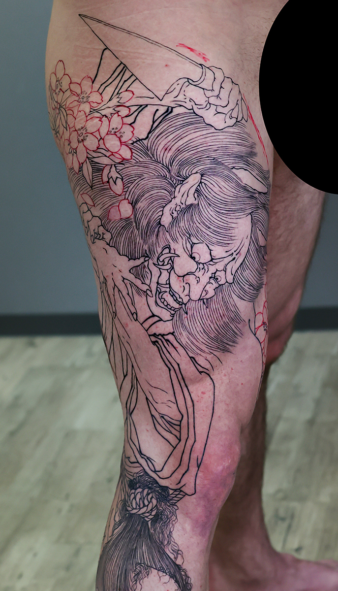 2025.11.09 夜叉 生首 桜 脚一本 和彫り 内もものほう中心の施術でした。 次回から本格的に背景、額に入ります。 お疲れ様でした。頑張っていきましょう! 制作事例 関連する記事 菊水 腕十分袖 和彫り 2026.01.07 八岐大蛇 ヤマタノオロチ 腕十分袖 和彫り 2025.12.23 一匹龍 腕十分袖 和彫り 2025.12.23