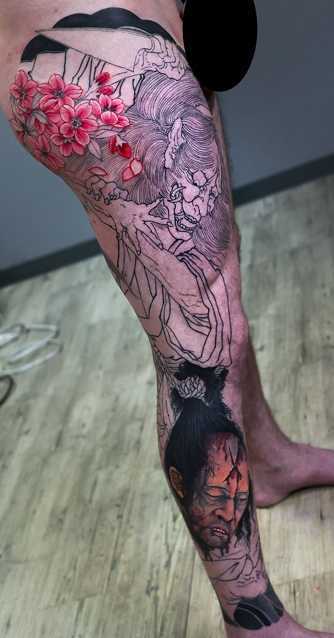 2026.02.16 夜叉 生首 脚一本 和彫り 桜のカラー中心の施術でした。まだ腫れていますが落ち着くと良い感じになると思います。 これから進んでいくと益々格好良くなっていくと思います。 お疲れ様でした。頑張っていきましょう! 制作事例 関連する記事 一匹龍 腕十分袖 和彫り 2026.02.16 達磨 雷神 腕九分袖 和彫り 2026.02.16 花鳥風月 雪椿 腕八分袖 和彫り 2026.02.16