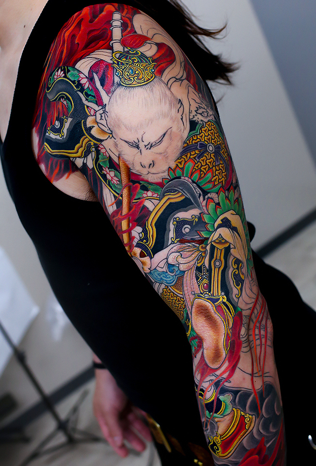 2023.06.12 孫悟空 西遊記 腕10分袖 製作中 着物、鎧のディテール中心の施術でした。 徐々にカラーが埋まってきました。ケアもバッチリですね! 引き続き頑張っていきましょう。 お疲れ様でした。 制作事例 関連する記事 菊水 腕十分袖 和彫り 2026.01.07 八岐大蛇 ヤマタノオロチ 腕十分袖 和彫り 2025.12.23 一匹龍 腕十分袖 和彫り 2025.12.23