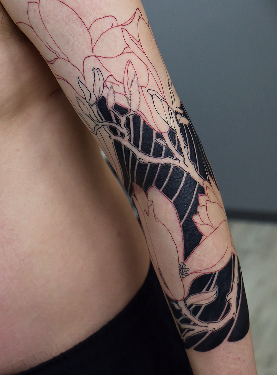 2024.02.03 木蓮 腕七分袖 製作中 額中心の施術でした。 デザイン的にシンプルですが、仕上がってくると存在感の高い刺青になると思います。 頑張っていきましょう!お疲れ様でした。 制作事例 関連する記事 菊水 腕十分袖 和彫り 2026.01.07 八岐大蛇 ヤマタノオロチ 腕十分袖 和彫り 2025.12.23 一匹龍 腕十分袖 和彫り 2025.12.23