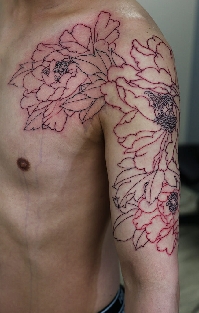 開始しました。五分袖になりますが色味を絞って華やかな牡丹刺青として仕上げていきたいと思います。
