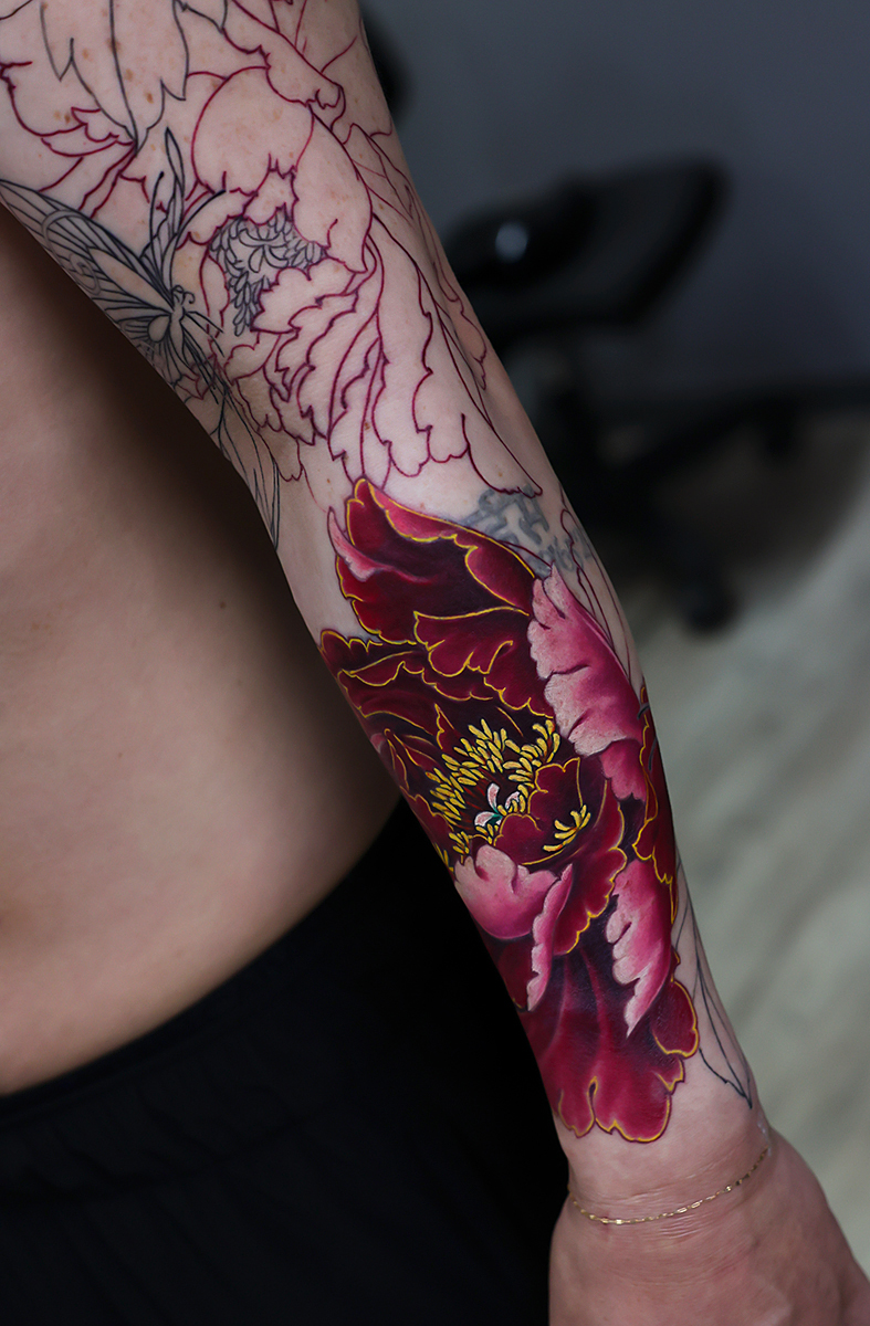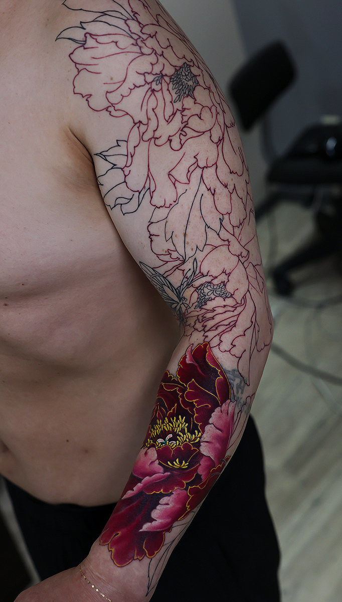 2025.07.23 牡丹 蝶 腕十分袖 和彫り 下部の牡丹カラーでした。形づいてきました。きれいですね! 先に下のカラーから進めていますが、胸の見切りまで入る予定です。 進みが楽しみですね。お疲れ様でした。 ひきつづき頑張っていきましょう。 制作事例 関連する記事 菊水 腕十分袖 和彫り 2026.01.07 八岐大蛇 ヤマタノオロチ 腕十分袖 和彫り 2025.12.23 一匹龍 腕十分袖 和彫り 2025.12.23