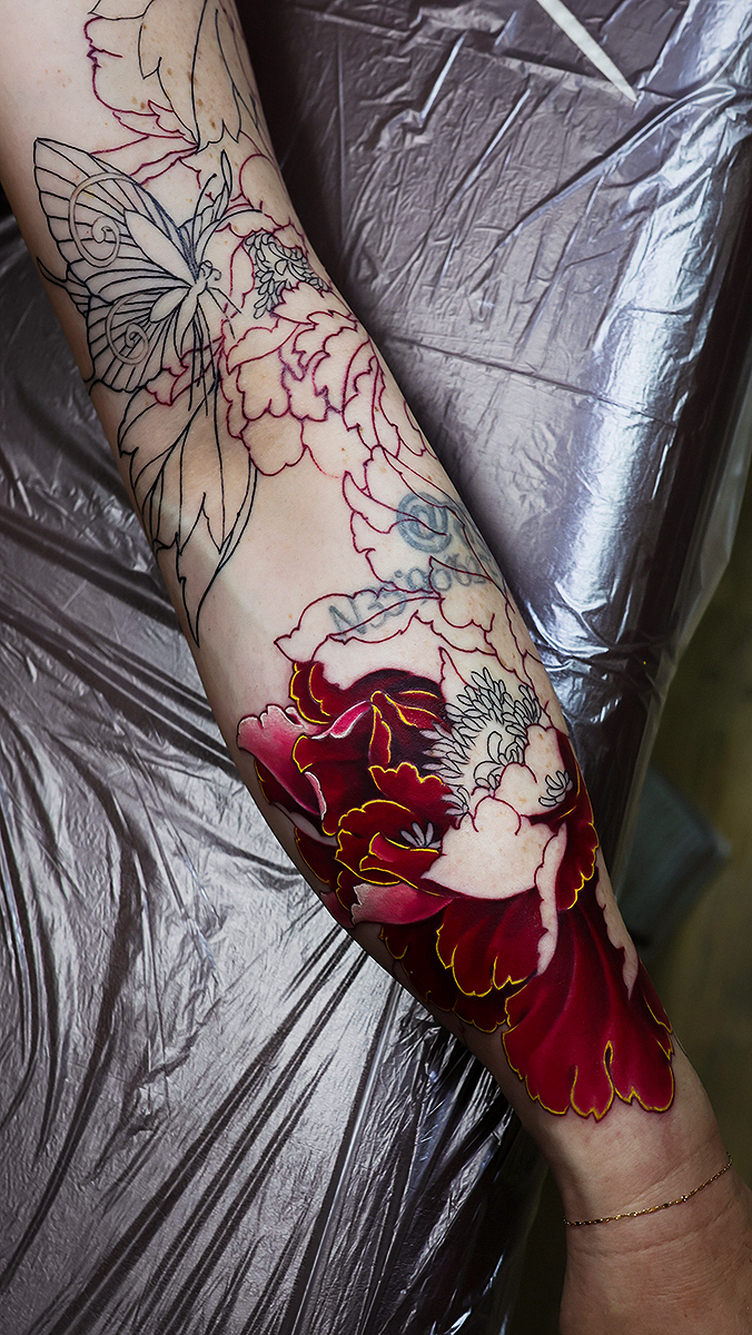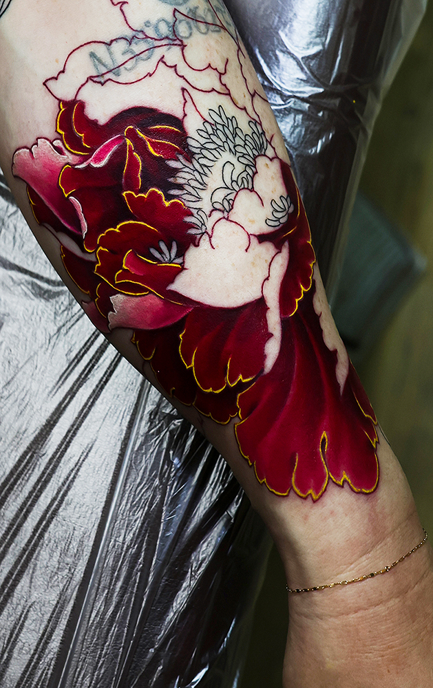 派手めな刺青を希望されているお客さんですので、肌質を考慮しつつ様々な色の牡丹で腕を飾っていきたいと思います。