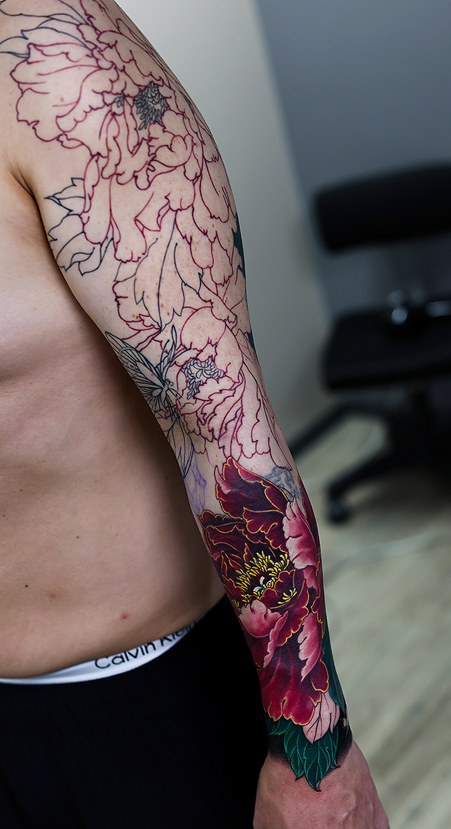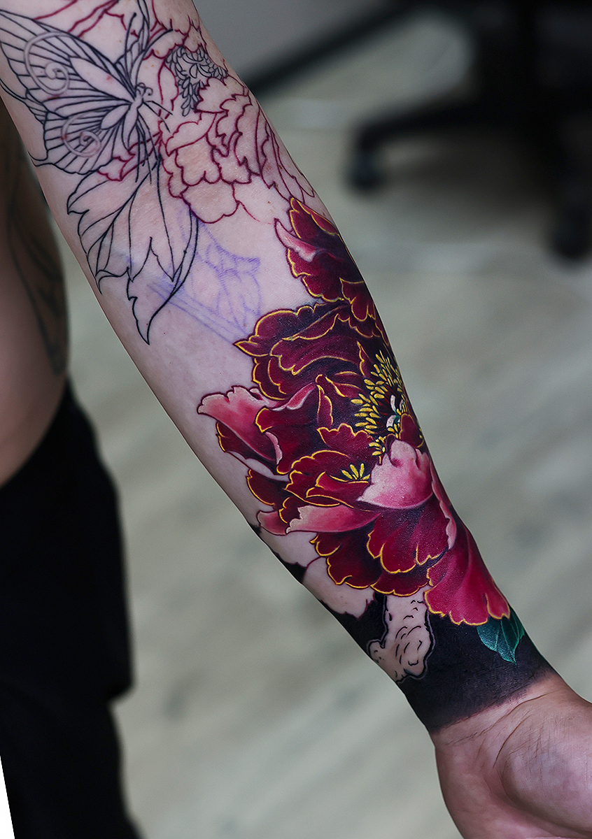 2025.09.21 牡丹蝶 腕十分袖 和彫り 見切り、背景のほう中心の施術でした。 長めの見切りにすることで、これから上部が埋まってくると腕全体の見栄えが格好良くなってくると思います。 お疲れ様でした。引き続き頑張っていきましょう! 制作事例 関連する記事 菊水 腕十分袖 和彫り 2026.01.07 八岐大蛇 ヤマタノオロチ 腕十分袖 和彫り 2025.12.23 一匹龍 腕十分袖 和彫り 2025.12.23