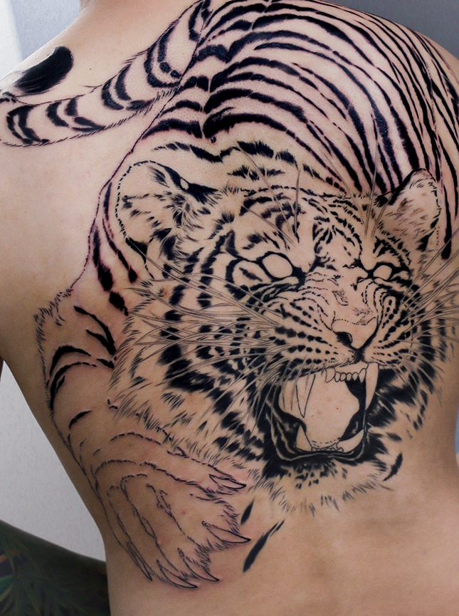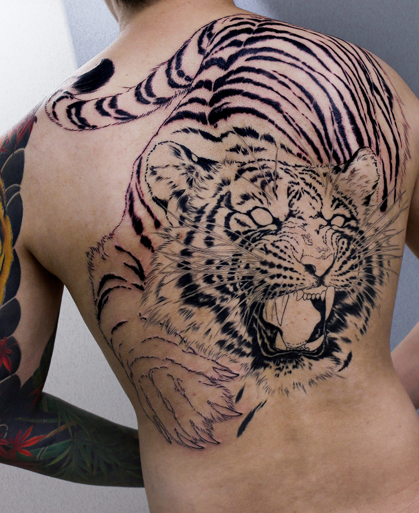 2023.07.30 猛虎 大蛇 背中一面 製作中 虎の胴体中心の施術でした。これから益々、虎の動きが表れてくると思います! 下部には大蛇が入る予定です。楽しみです。 ひきつづき頑張っていきましょう!お疲れ様でした。 制作事例 関連する記事 菊水 腕十分袖 和彫り 2026.01.07 八岐大蛇 ヤマタノオロチ 腕十分袖 和彫り 2025.12.23 一匹龍 腕十分袖 和彫り 2025.12.23
