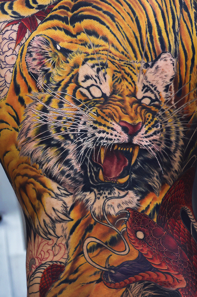 2025.07.23 猛虎 菊蛇 背中一面 和彫り 顔のディテールのほうメインでした。この工程は一見変化が分かりづらいですが結構な重要なところでして、仕上がったのちの印象がよりリアルになっていきます。 格好良いですね。これから益々変化していくと思います。 お疲れ様でした。ひきつづき頑張っていきましょう! 制作事例 関連する記事 菊水 腕十分袖 和彫り 2026.01.07 八岐大蛇 ヤマタノオロチ 腕十分袖 和彫り 2025.12.23 一匹龍 腕十分袖 和彫り 2025.12.23