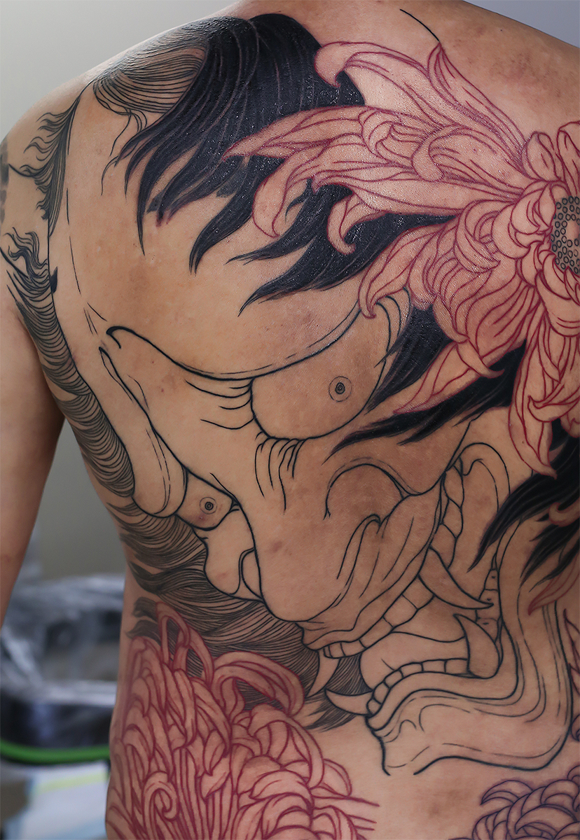 2024.12.17 般若 菊 背中一面 般若、髪の毛中心の施術でした。 インパクトありますね!まだまだこれから変化していきます。 お疲れ様でした。ひきつづき頑張っていきましょう。 制作事例 関連する記事 菊水 腕十分袖 和彫り 2026.01.07 八岐大蛇 ヤマタノオロチ 腕十分袖 和彫り 2025.12.23 一匹龍 腕十分袖 和彫り 2025.12.23
