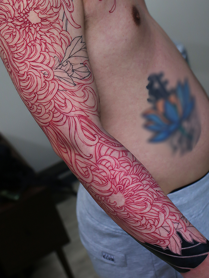 とても細かい筋でしたが赤で引いています。黒で引くのとは花のリアリティや存在感、腕全体の華やかさが大きく異なってきますので。