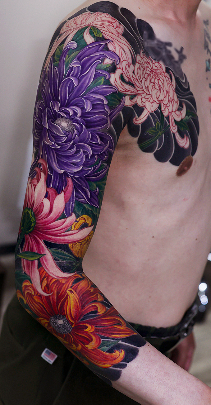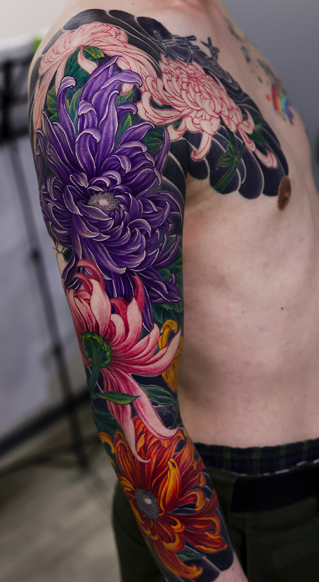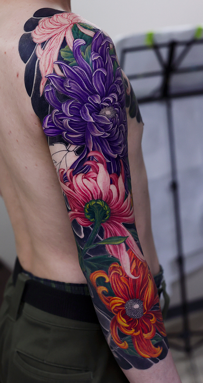 2025.06.24 菊 腕七分袖 和彫り 花びらにハイライトが入りました。 馴染むとはっきりしてきます。色とりどりの菊、とても良いです。 お疲れ様でした。ひきつづき頑張っていきましょう! 制作事例 関連する記事 菊水 腕十分袖 和彫り 2026.01.07 八岐大蛇 ヤマタノオロチ 腕十分袖 和彫り 2025.12.23 一匹龍 腕十分袖 和彫り 2025.12.23