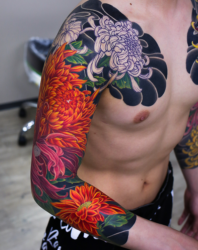 もちろんデザインや色使いなどもありますが、この存在感、目を奪われる、思わず一瞬目がとまってしまうような…そんなひきつけられる刺青は感動的で、やはりすごいなあと感じます。