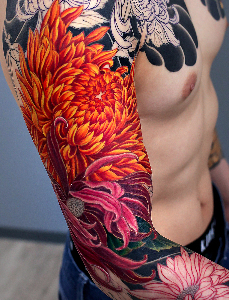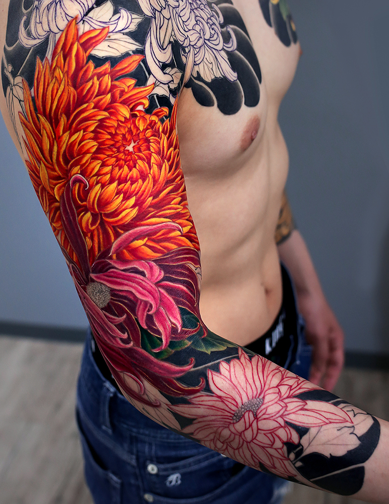 2023.05.31 菊 腕七分袖 製作中 ひきつづき菊のカラー中心の施術でした。 大輪の菊、とても綺麗ですね。 肌のコンデションやアフターケアなど含めて、刺青を大切にしてくれているのがわかります。感謝です。 素晴らしい刺青に仕上がると思います。 頑張っていきましょう! お疲れ様でした 制作事例 関連する記事 菊水 腕十分袖 和彫り 2026.01.07 八岐大蛇 ヤマタノオロチ 腕十分袖 和彫り 2025.12.23 一匹龍 腕十分袖 和彫り 2025.12.23