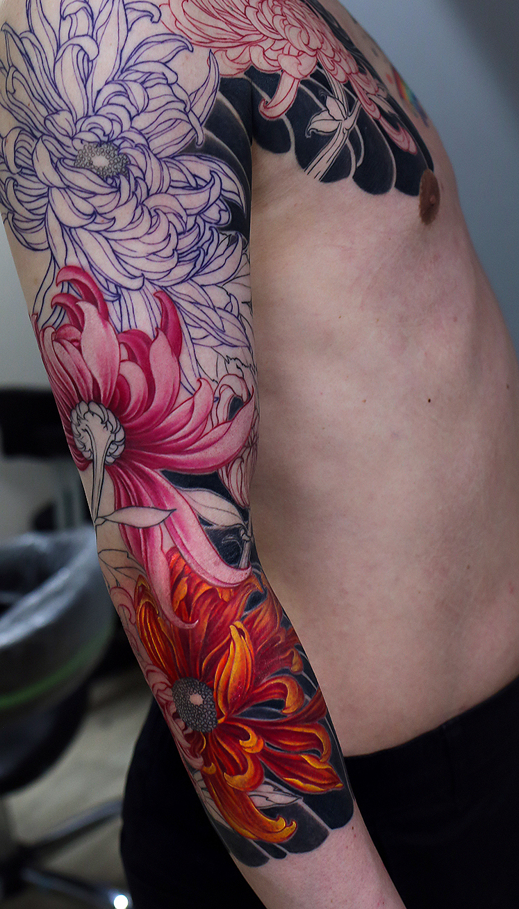2024.11.10 菊 腕七分袖 真ん中の菊のカラーでした。 立体感のあるカラーにしていければとおもいます。 コンディションのほうよろしくです。 お疲れ様した。頑張っていきましょう。 制作事例 関連する記事 菊水 腕十分袖 和彫り 2026.01.07 八岐大蛇 ヤマタノオロチ 腕十分袖 和彫り 2025.12.23 一匹龍 腕十分袖 和彫り 2025.12.23