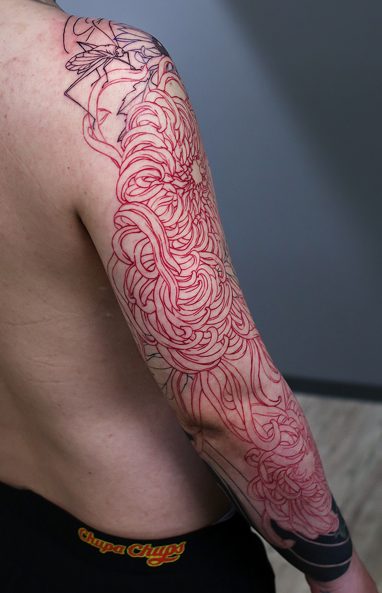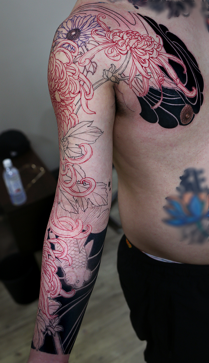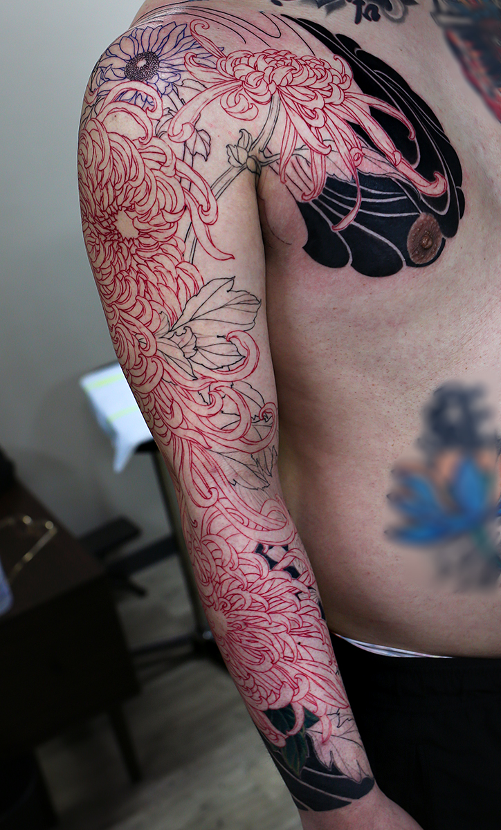 肩回りに小ぶりの菊とバッタを追加しました。全体的なデザインとしてとても良いアクセントになってくると思います。