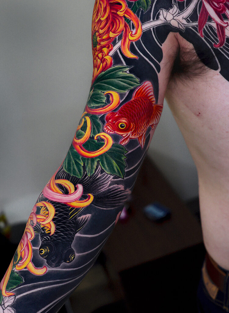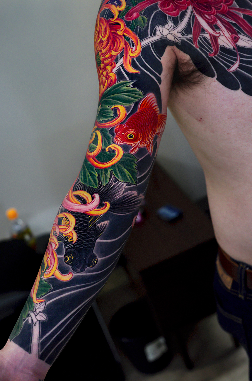 2026.01.07 菊水 腕十分袖 和彫り 赤い金魚のほうもカラーが入りました。 赤と黒の金魚、出目金、とても良いポイントとなっていると思います。 お疲れ様でした。頑張っていきましょう。 制作事例 関連する記事 八岐大蛇 ヤマタノオロチ 腕十分袖 和彫り 2025.12.23 一匹龍 腕十分袖 和彫り 2025.12.23 夜叉 生首 脚一本 和彫り 2025.12.23