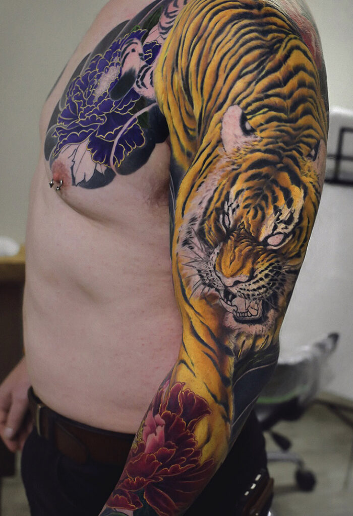 2024.04.06 虎 牡丹 腕九分袖 製作中 胸の牡丹のカラーメインでした。 お疲れ様でした。 これから暖かくなるシーズンですが、 大量のアルコール摂取は肌の乾燥や皮膚の炎症を起こしたり、施術の治りも遅くなってしまったりするので、刺青に良いことは一つもありません。 肌を露出するシーズンですが日焼け対策は万全にしてください。 過剰な筋トレや永久脱毛なども皮膚に悪影響を及ぼしますので注意が必要ですね。 制作事例 関連する記事 菊水 腕十分袖 和彫り 2026.01.07 八岐大蛇 ヤマタノオロチ 腕十分袖 和彫り 2025.12.23 一匹龍 腕十分袖 和彫り 2025.12.23