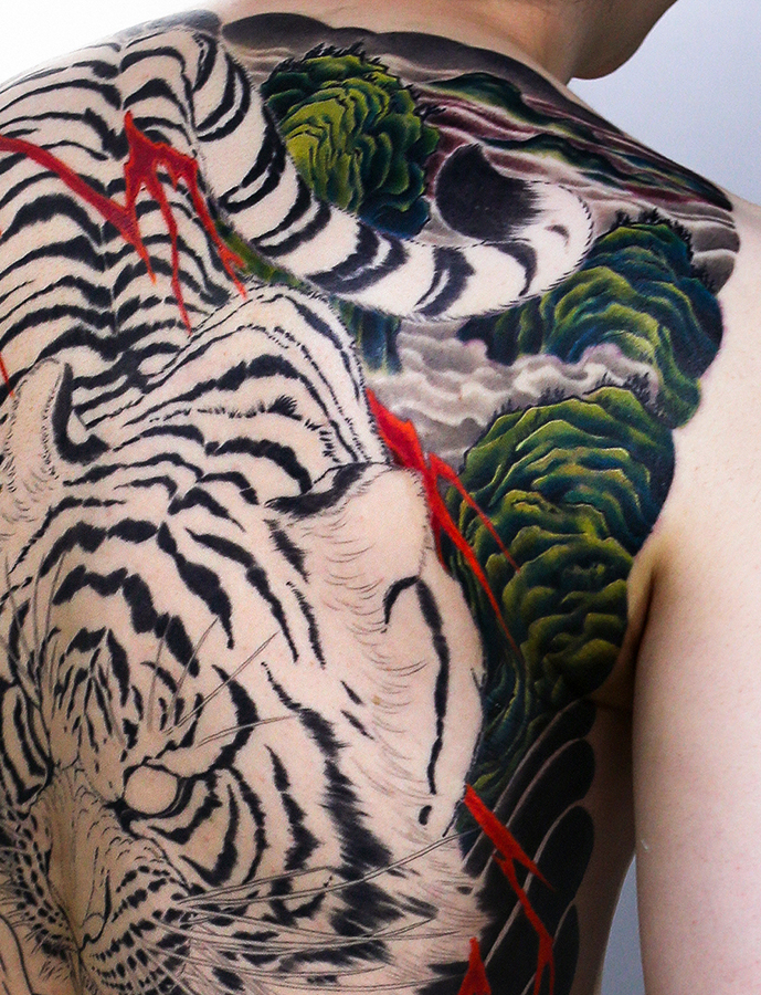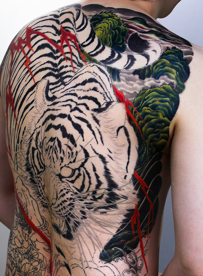 2023.06.07 虎 雷神図 背中一面 製作中 背景、岩山とてもよい雰囲気です。 これからどんどん格好良くなっていくと思います! 頑張りましょう! 差し入れ頂きありがとうございます。 お疲れ様でした。 制作事例 関連する記事 菊水 腕十分袖 和彫り 2026.01.07 八岐大蛇 ヤマタノオロチ 腕十分袖 和彫り 2025.12.23 一匹龍 腕十分袖 和彫り 2025.12.23
