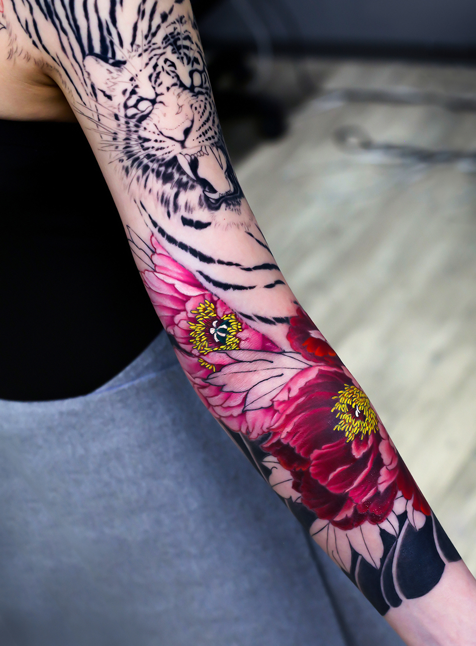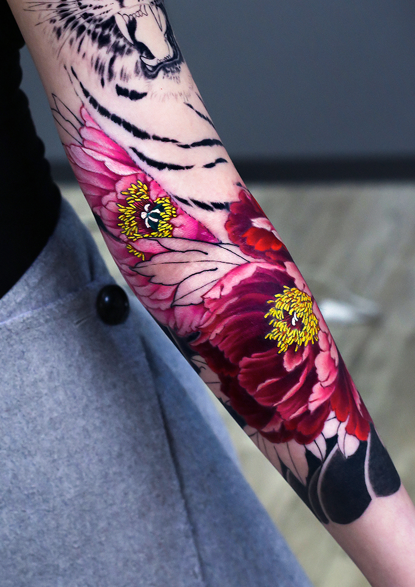 2025.01.16 虎牡丹 腕八分袖 牡丹二輪のカラーでした。 綺麗ですね!ひきつづき頑張りましょう。 お疲れ様でした。 制作事例 関連する記事 菊水 腕十分袖 和彫り 2026.01.07 八岐大蛇 ヤマタノオロチ 腕十分袖 和彫り 2025.12.23 一匹龍 腕十分袖 和彫り 2025.12.23