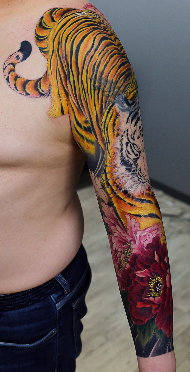2024.08.11 虎牡丹 腕十分袖 虎の胴体が埋まってきました。迫力ありますね! もちろん胸の見切りも入る予定です。また雰囲気が大きく変わってくると思います。 遠方からいつもありがとうございます。 ひきつづき頑張っていきましょう!お疲れ様でした。 制作事例 関連する記事 菊水 腕十分袖 和彫り 2026.01.07 八岐大蛇 ヤマタノオロチ 腕十分袖 和彫り 2025.12.23 一匹龍 腕十分袖 和彫り 2025.12.23
