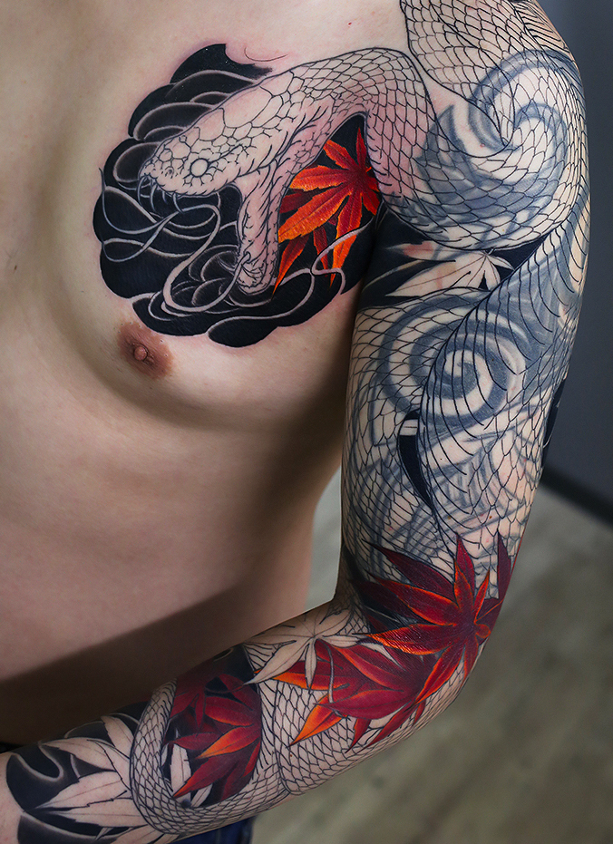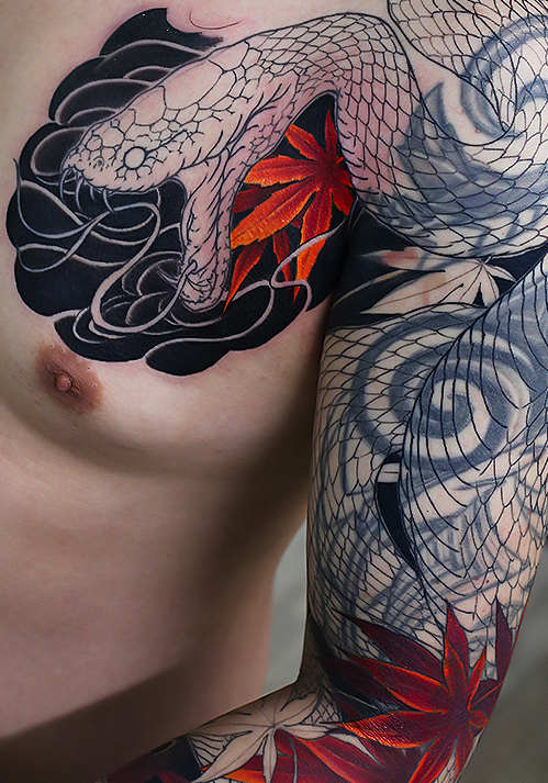 2023.06.07 蛇 紅葉 カバーアップ 腕九分袖 製作中 胸の見切り中心の施術でした。 順調に進んでいます。徐々にカバー部分が隠れてきましたね! ひきつづき頑張っていきましょう。 お疲れ様でした 制作事例 関連する記事 菊水 腕十分袖 和彫り 2026.01.07 八岐大蛇 ヤマタノオロチ 腕十分袖 和彫り 2025.12.23 一匹龍 腕十分袖 和彫り 2025.12.23