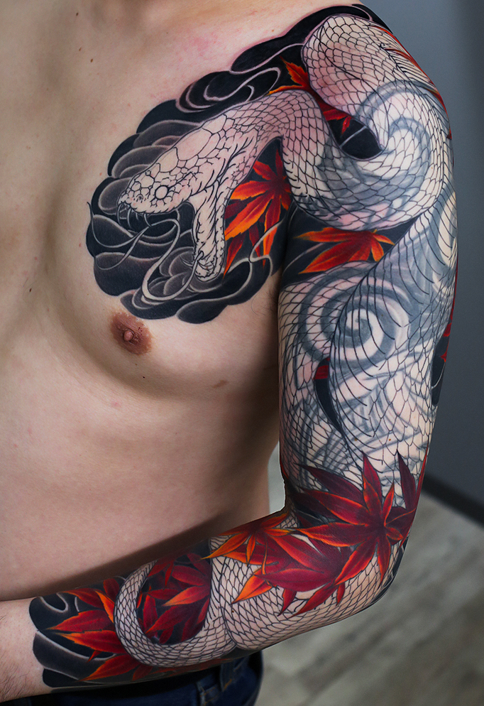 2023.08.16 蛇ともみじ カーアップ 腕九分袖 製作中 次回から蛇のカラーに入る予定です。カバーも順調に進んでおります。 お疲れ様でした。ひきつづき頑張っていきましょう! 制作事例 関連する記事 菊水 腕十分袖 和彫り 2026.01.07 八岐大蛇 ヤマタノオロチ 腕十分袖 和彫り 2025.12.23 一匹龍 腕十分袖 和彫り 2025.12.23