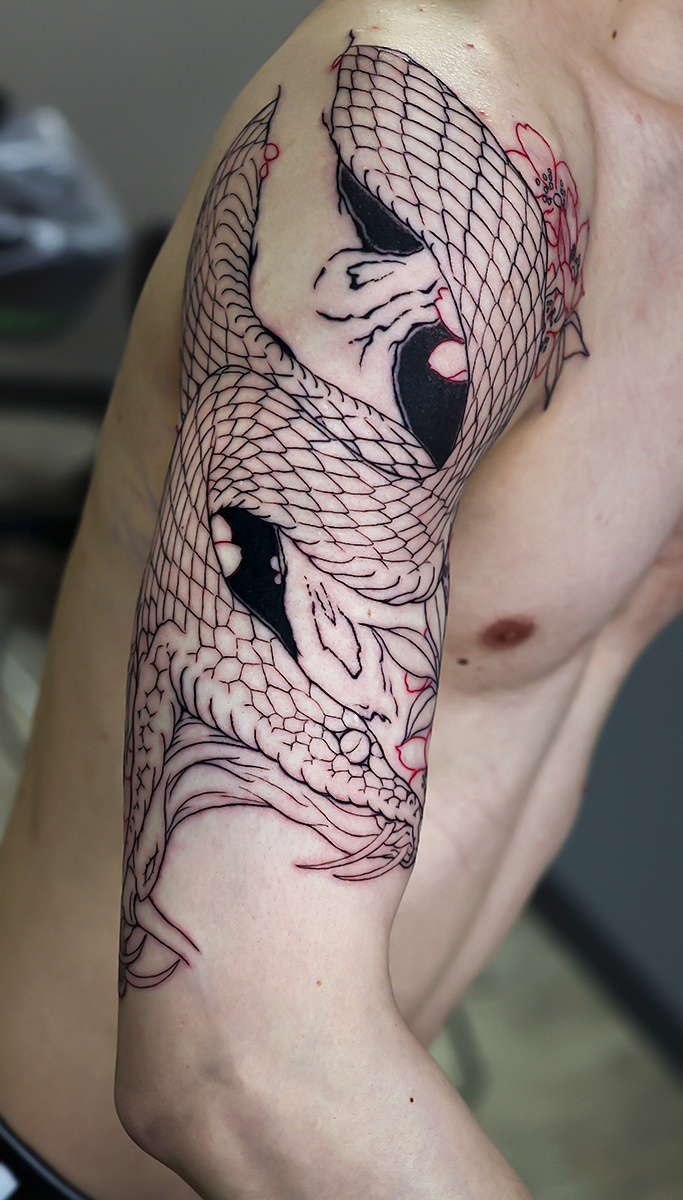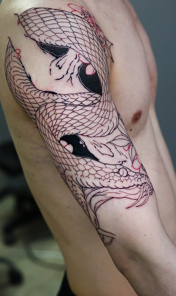 2026.02.07 蛇と桜 腕 十分袖 和彫り 開始です。桜の木に巻き付く蛇です。 口を大きく広げたデザインですので迫力があります。格好良くなっていくと思います! お疲れ様でした。ひきつづき頑張っていきましょう。 制作事例 関連する記事 地獄太夫 Jigoku-Dayu 背中一面 和彫り 2026.02.07 菊 腕八分袖 和彫り 2026.02.07 鳳凰 牡丹 背中一面 和彫り 2026.02.01