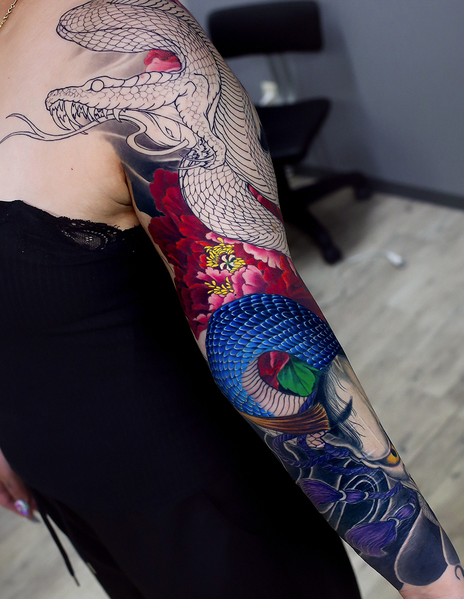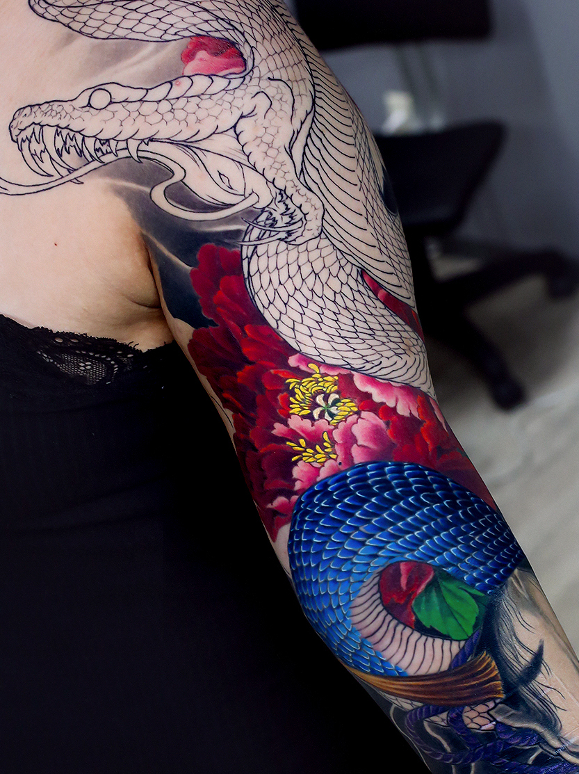 2023.12.18 蛇と牡丹 腕十分袖 製作中 蛇のカラーのほう、先に入りました。 蛇のうろこ、一枚づつ色づけしながら全体のグラデーションを表現しています。 根気のいる施術ですが、この細かい作業の集合体がこのような仕上がりになってきますので、集中力を絶やさないように心がけています。 進みが楽しみです! お疲れ様でした。 制作事例 関連する記事 菊水 腕十分袖 和彫り 2026.01.07 八岐大蛇 ヤマタノオロチ 腕十分袖 和彫り 2025.12.23 一匹龍 腕十分袖 和彫り 2025.12.23