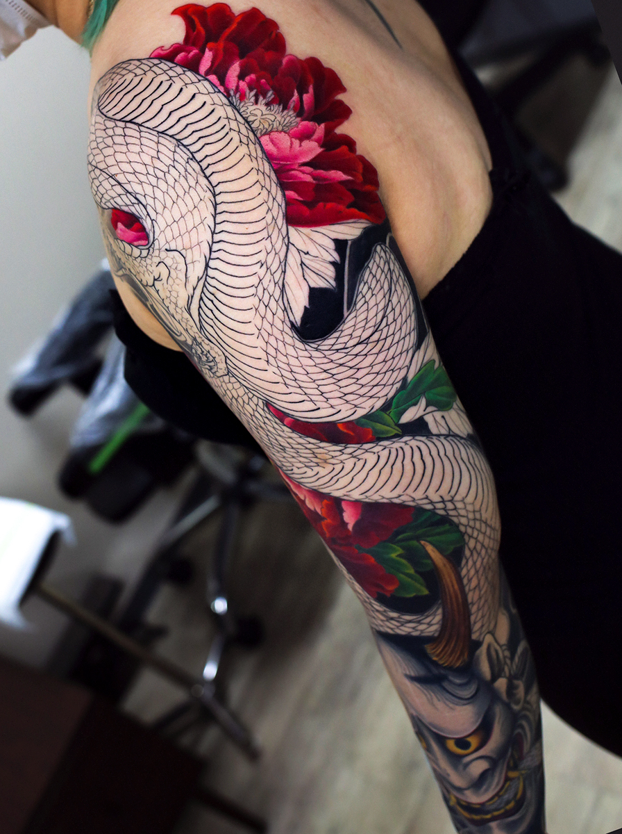 2023.10.23 蛇と般若 牡丹 腕十分袖 肩後部の牡丹のカラーメインでした。 赤の牡丹。オレンジ系によっていくカラーと、ピンク系によっていくカラーとで、レッドから二通りのグラデーションで色付けをしていきます。 刺青には単色べた塗りの良さも別の意味合いであると思いますが、こういった雰囲気を作り出すのには、針先の微妙なカラーを常に意識しながら進めていかなければなりません。 綺麗ですね! お疲れ様でした。 制作事例 関連する記事 菊水 腕十分袖 和彫り 2026.01.07 八岐大蛇 ヤマタノオロチ 腕十分袖 和彫り 2025.12.23 一匹龍 腕十分袖 和彫り 2025.12.23