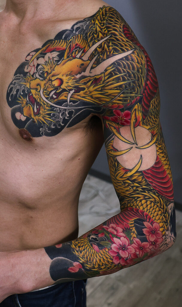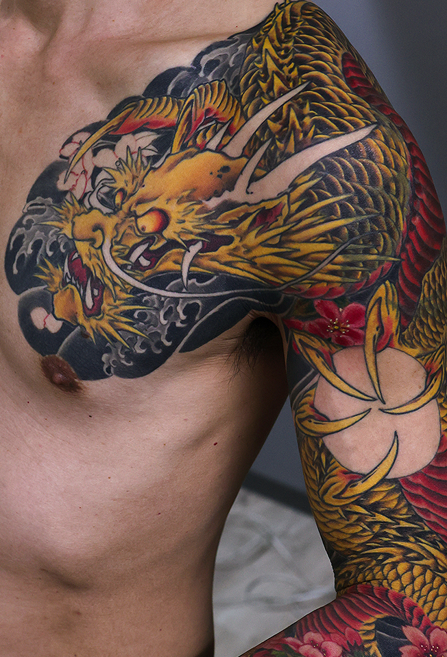 2025.03.22 金龍 腕九分袖 カバー だいぶ形づいてきました。 黄色系の龍のオーダーでしたのでカバー部分がどうでるか?特に考慮しましたがだいぶ目立たなくなってきました。 ひきつづき頑張っていきましょう。お疲れ様でした。 彫る上てお客さんの肌質を理解する、把握したうえで制作していくことが大切です。そのためには可能な限りお客さんの生活面や体調面などのヒアリングもとても大切になってきます。彫師はお客さん一人ひとりとしっかり向き合いながら進めていける彫師なのかどうか、ここが特に大事です。 制作事例 関連する記事 菊水 腕十分袖 和彫り 2026.01.07 八岐大蛇 ヤマタノオロチ 腕十分袖 和彫り 2025.12.23 一匹龍 腕十分袖 和彫り 2025.12.23