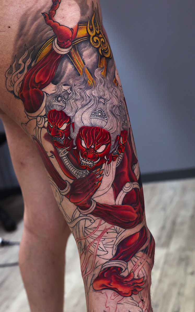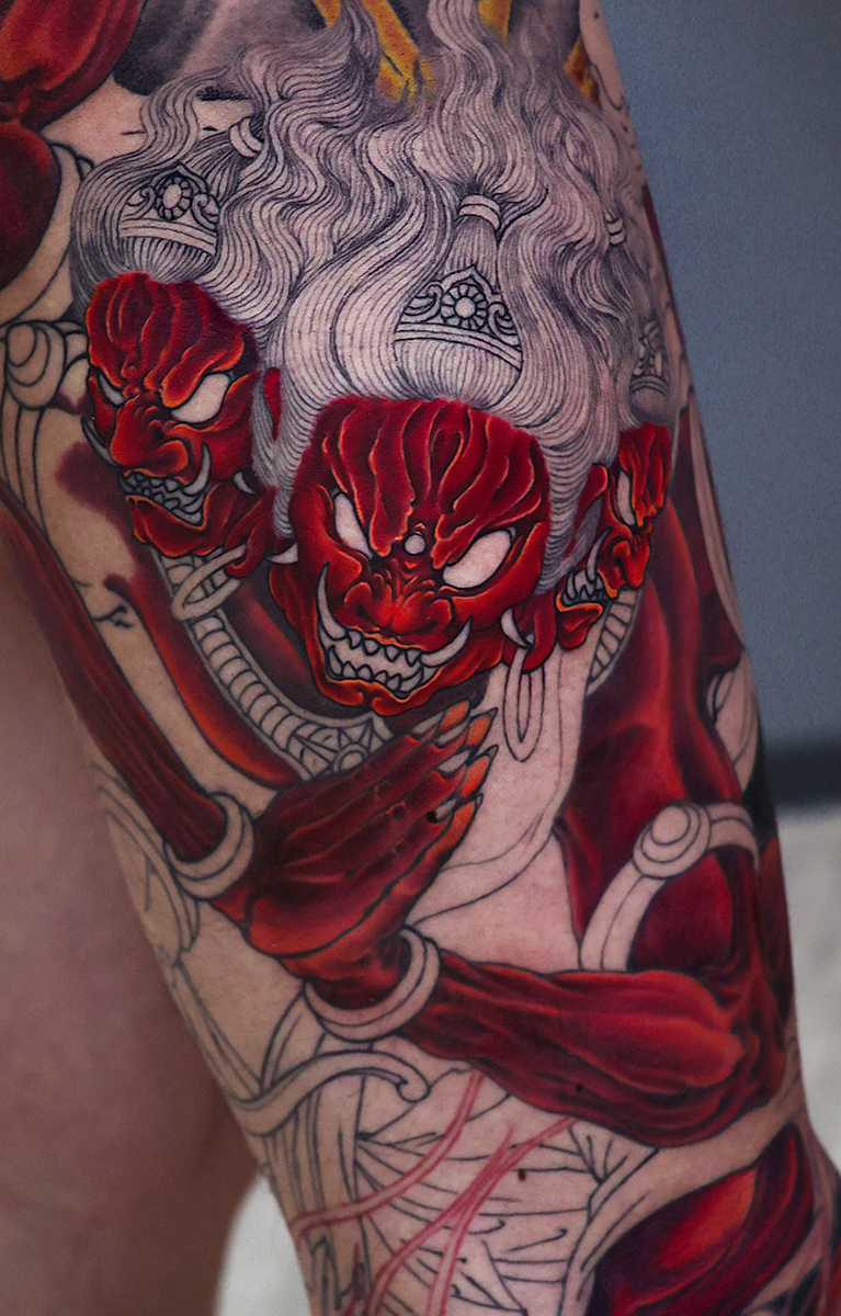 2025.07.08 阿修羅 脚一本 和彫り 三面、顔のカラーメインでした。目玉ももちろん入る予定です。 阿修羅は憎しみや怒りなどを司る神でもありますので、そんな表情をイメージしました。 格好良いですね!目や口が入ると一段と雰囲気が増すと思います。 お疲れ様でした。ひきつづき頑張っていきましょう。 制作事例 関連する記事 菊水 腕十分袖 和彫り 2026.01.07 八岐大蛇 ヤマタノオロチ 腕十分袖 和彫り 2025.12.23 一匹龍 腕十分袖 和彫り 2025.12.23