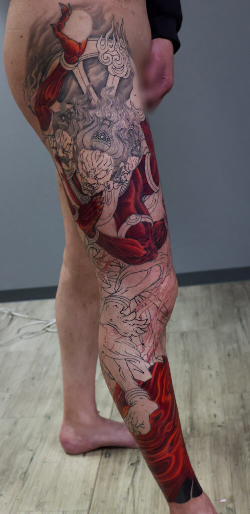 2025.03.22 阿修羅 脚一本 五、六色ほどのカラーを使って炎をグラデーションで色付けしています。 立体感や陰影のある炎なります。 お疲れ様でした。 制作事例 関連する記事 菊水 腕十分袖 和彫り 2026.01.07 八岐大蛇 ヤマタノオロチ 腕十分袖 和彫り 2025.12.23 一匹龍 腕十分袖 和彫り 2025.12.23