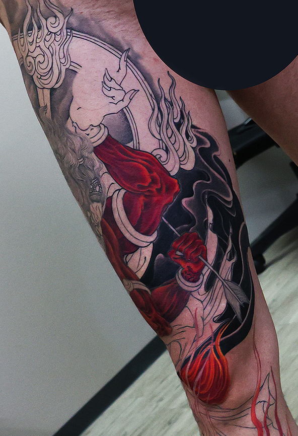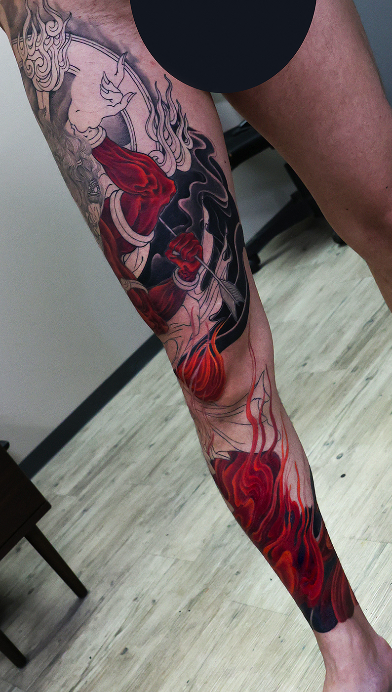 2025.04.08 阿修羅 脚一本 和彫り 脚内側中心の施術でした。背景が入ってくると主体が引き立ってきます。 お疲れ様でした。 制作事例 関連する記事 菊水 腕十分袖 和彫り 2026.01.07 八岐大蛇 ヤマタノオロチ 腕十分袖 和彫り 2025.12.23 一匹龍 腕十分袖 和彫り 2025.12.23