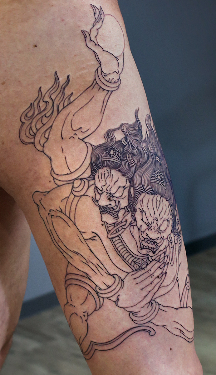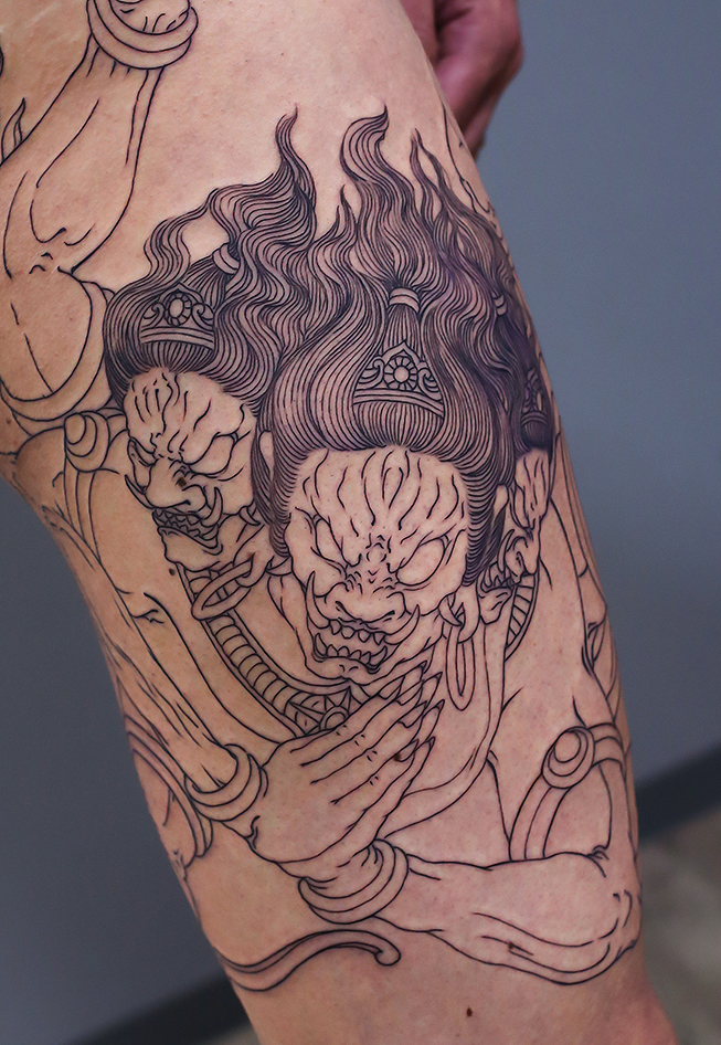 2024.06.17 阿修羅 足一本 製作中 阿修羅 開始しました。 Fullleg足一本で仕上げていく予定です。バランスのとりづらいモチーフですが大きさともにベストです。 阿修羅、鬼神らしく迫力をだしていけたらと思います。格好良くなりそうですね。 初回お疲れ様でした。ゆっくりと休んでください。 制作事例 関連する記事 菊水 腕十分袖 和彫り 2026.01.07 八岐大蛇 ヤマタノオロチ 腕十分袖 和彫り 2025.12.23 一匹龍 腕十分袖 和彫り 2025.12.23