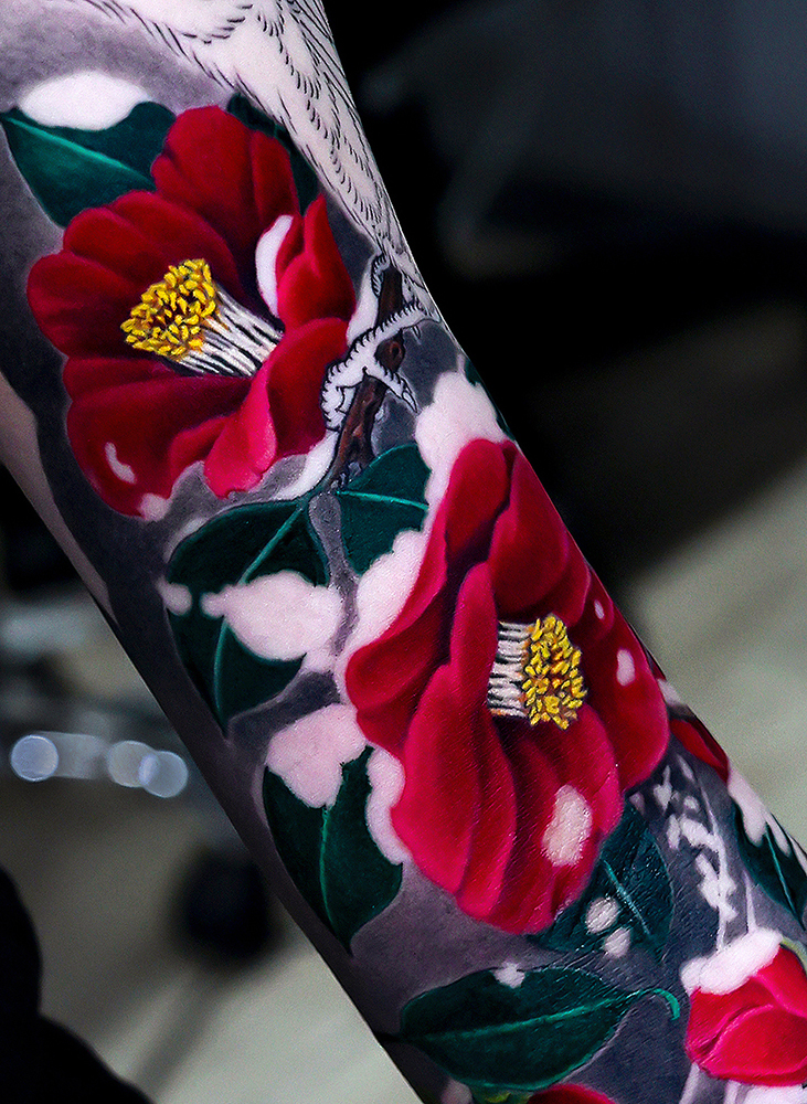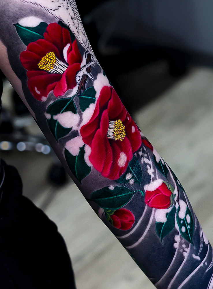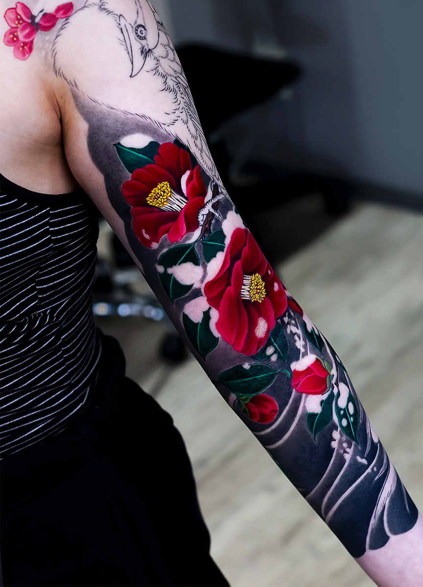 2025.12.03 雪椿 腕八分袖 和彫り 内側がだいぶ埋まってきました。雪椿、花鳥画、とても雰囲気があり格好良いです。 ひきつづき頑張っていきましょう。お疲れ様でした。 制作事例 関連する記事 菊水 腕十分袖 和彫り 2026.01.07 八岐大蛇 ヤマタノオロチ 腕十分袖 和彫り 2025.12.23 一匹龍 腕十分袖 和彫り 2025.12.23