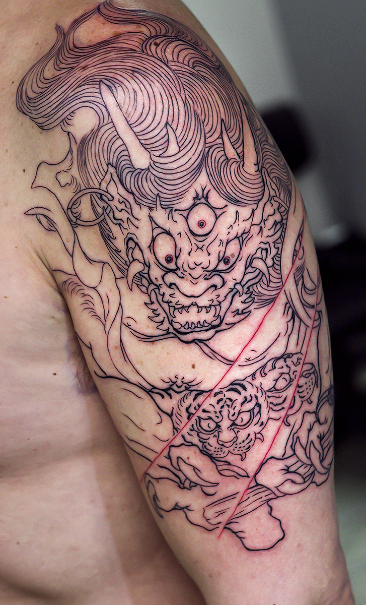 2025.11.12 雷神 達磨 腕八分袖 和彫り 初回筋彫りスタートしました。 下部には達磨が入ってくる予定です。雷神の躍動感をふんだんにだしていけたらと思います。 お疲れ様でした。ひきつづき頑張っていきましょう。 制作事例 関連する記事 菊水 腕十分袖 和彫り 2026.01.07 八岐大蛇 ヤマタノオロチ 腕十分袖 和彫り 2025.12.23 一匹龍 腕十分袖 和彫り 2025.12.23
