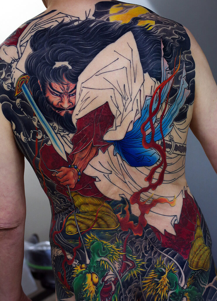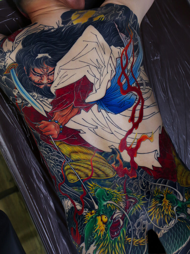 2023.12.13 須佐之男命 八岐大蛇退治 背中一面 製作中 帯のブルーがきれいです。前回の顔もバッチリですね! ひきつづき頑張っていきましょう。 お疲れ様でした。 制作事例 関連する記事 菊水 腕十分袖 和彫り 2026.01.07 八岐大蛇 ヤマタノオロチ 腕十分袖 和彫り 2025.12.23 一匹龍 腕十分袖 和彫り 2025.12.23