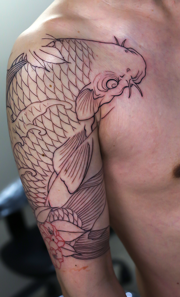 2025.01.16 鯉 八重桜 五分袖 開始です!腕から胸にかけて動きのある鯉になります。 よいアングルです! 初回お疲れ様でした。ひきづつき頑張っていきましょう。 制作事例 関連する記事 菊水 腕十分袖 和彫り 2026.01.07 八岐大蛇 ヤマタノオロチ 腕十分袖 和彫り 2025.12.23 一匹龍 腕十分袖 和彫り 2025.12.23